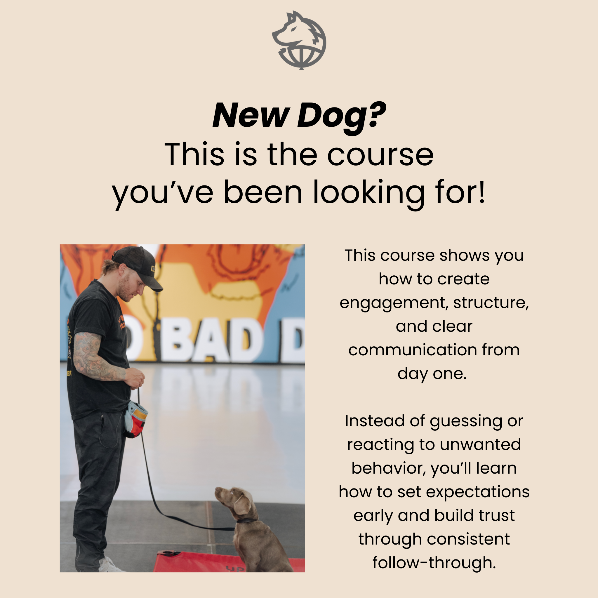 The step-by-step foundation course every dog owner needs. Learn how to build trust, create structure, and eliminate unwanted behaviors — using only a leash, food, and a basic collar.
